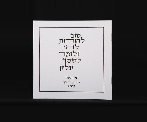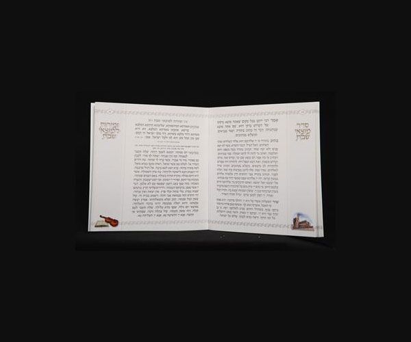 תוכן: זמירות שבת, שירים חסידיים, קידוש, ברכת המזון, הבדלה – פסוק "טוב להודות לה' ולזמר לשמך עליון" על הכריכה.
